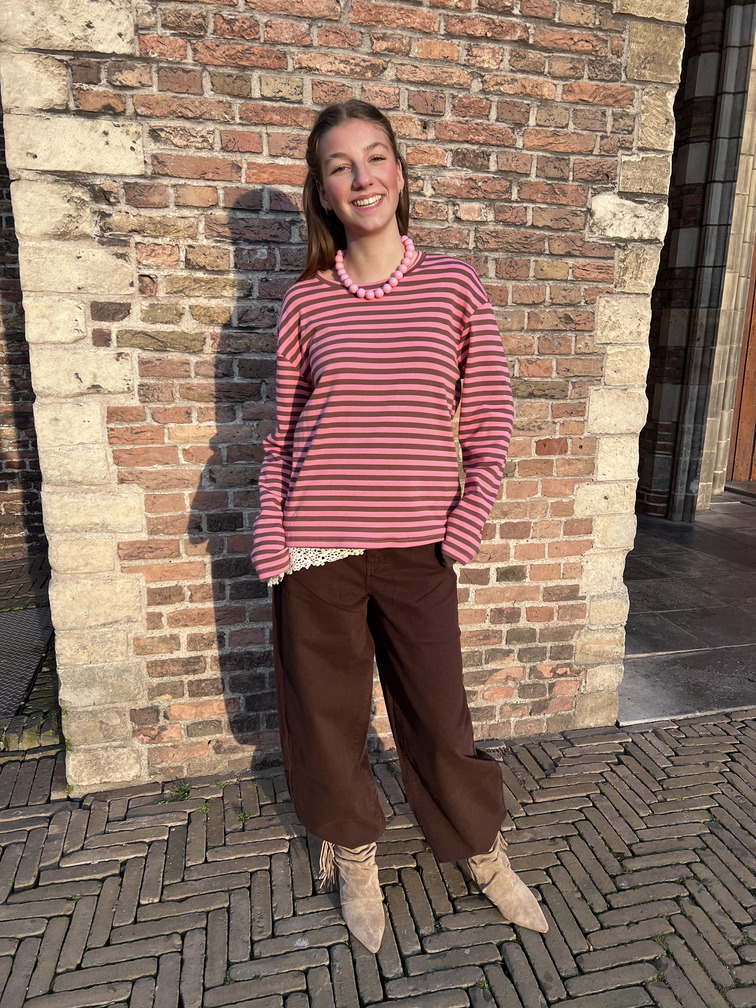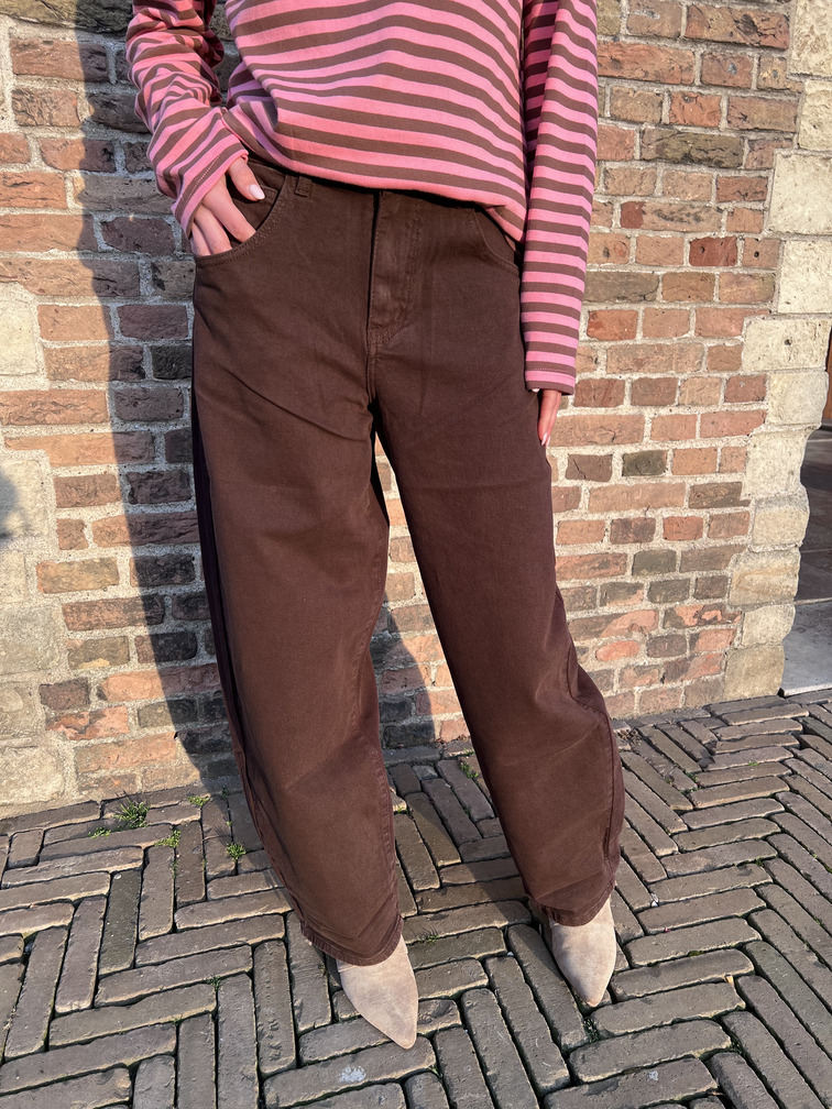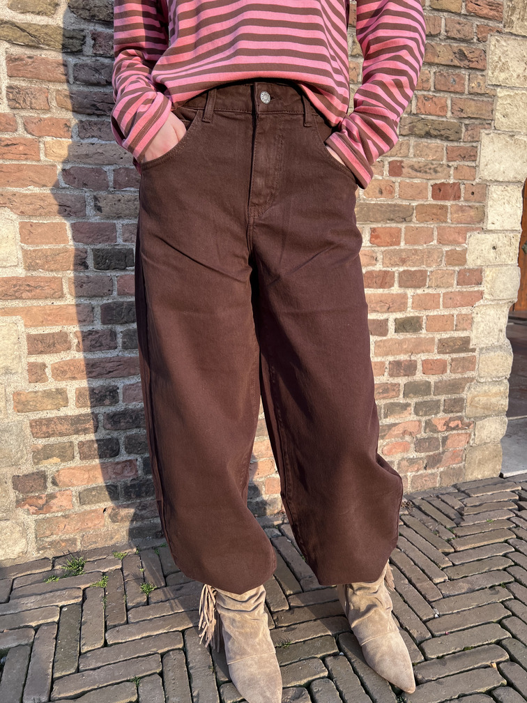 Deze bruine jeans is een echte must-have voor dit seizoen. Het model heeft een hoge taille en een balloon fit, wat zorgt voor een tijdloze en flatterende pasvorm. De zachte denimstof draagt comfortabel en is makkelijk te combineren met zowel knitwear als blouses. Een veelzijdige basic met een trendy twist.