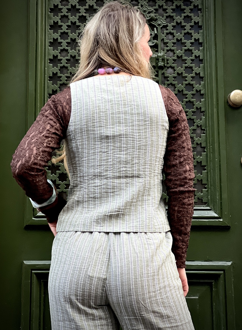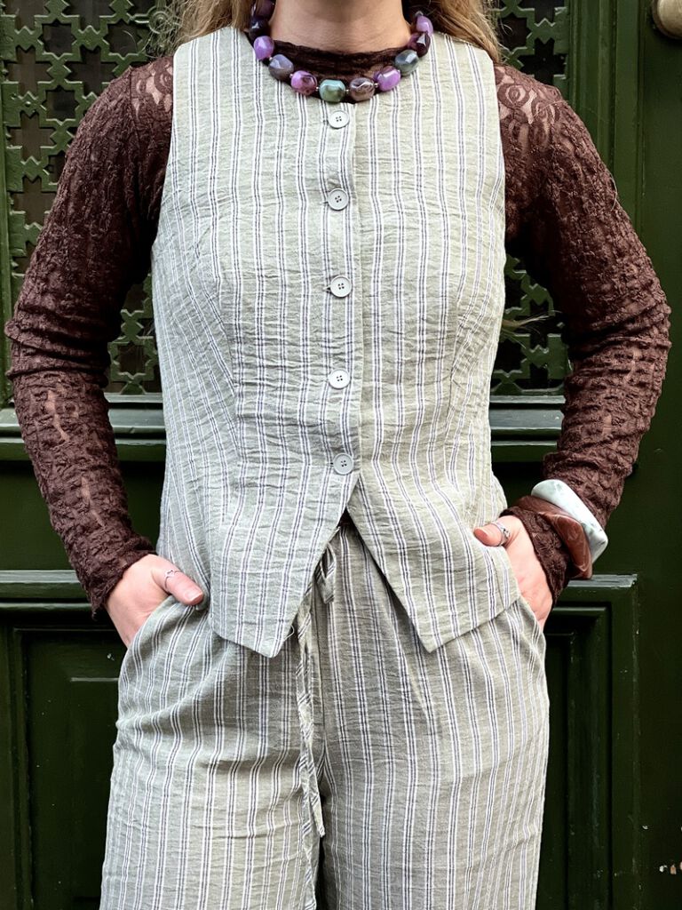 Deze gestreepte wide leg broek heeft een relaxte, rechte pasvorm die mooi langs het lichaam valt. De verticale strepen geven lengte en een speelse, frisse uitstraling. Dankzij de elastische tailleband met striksluiting zit ze comfortabel, zonder in te leveren op vorm.
