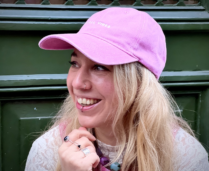 Deze zachtroze “Chill Vibes” pet is voor dagen waarop je licht wilt reizen. Los haar, een subtiele glimlach, zon op je huid. Casual, maar met karakter.