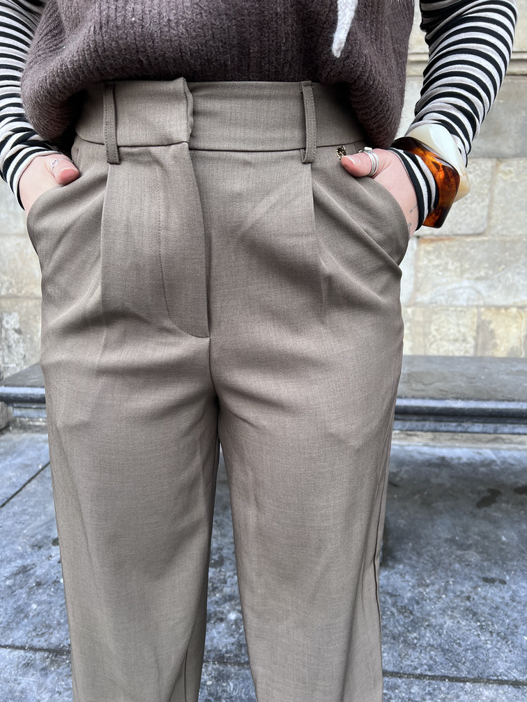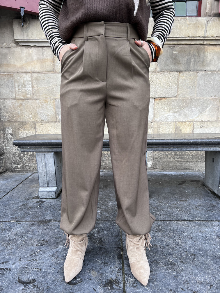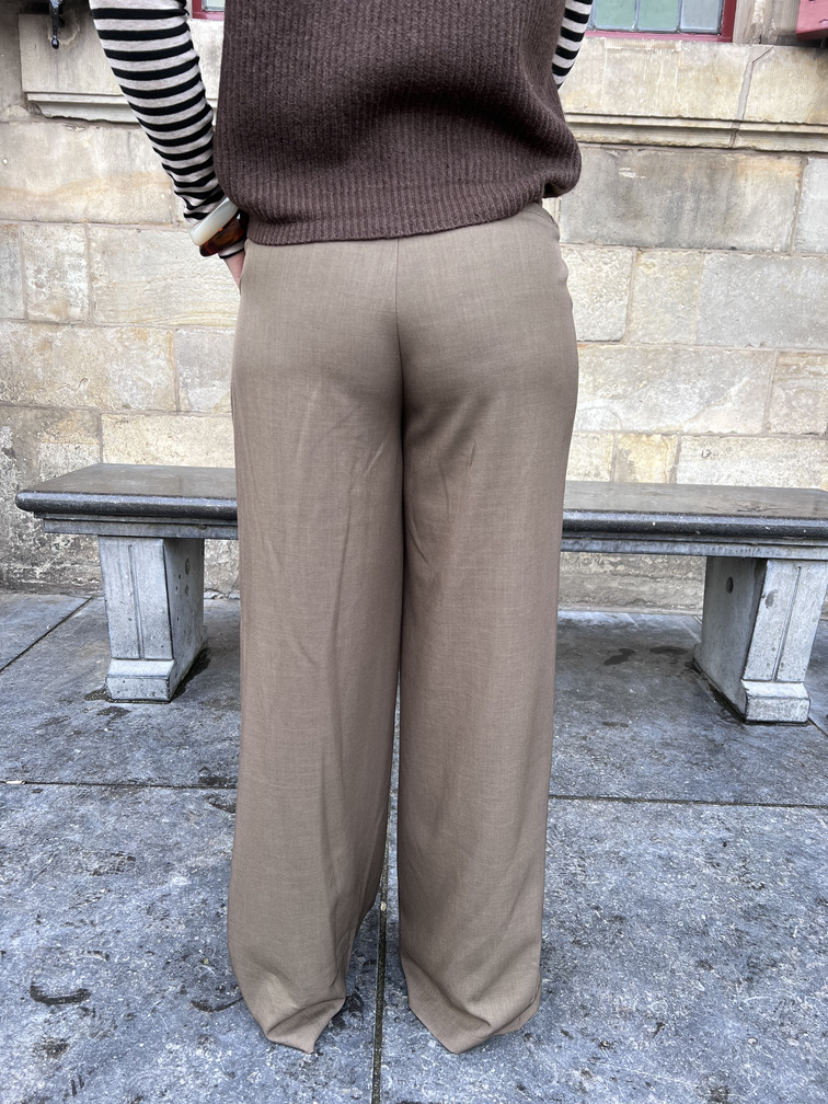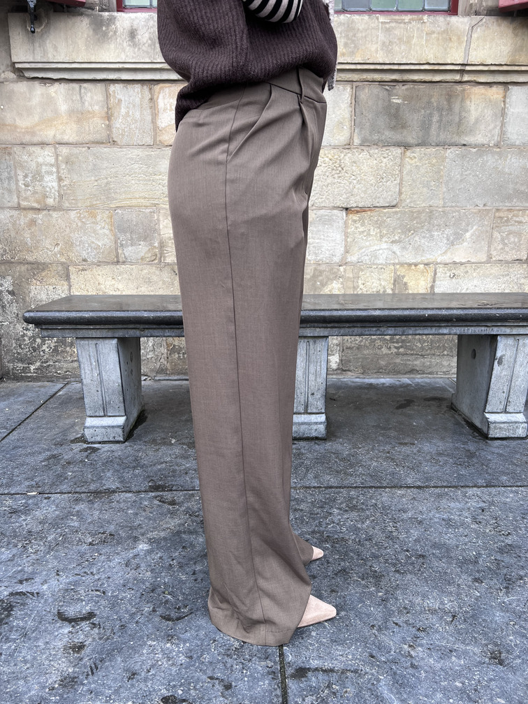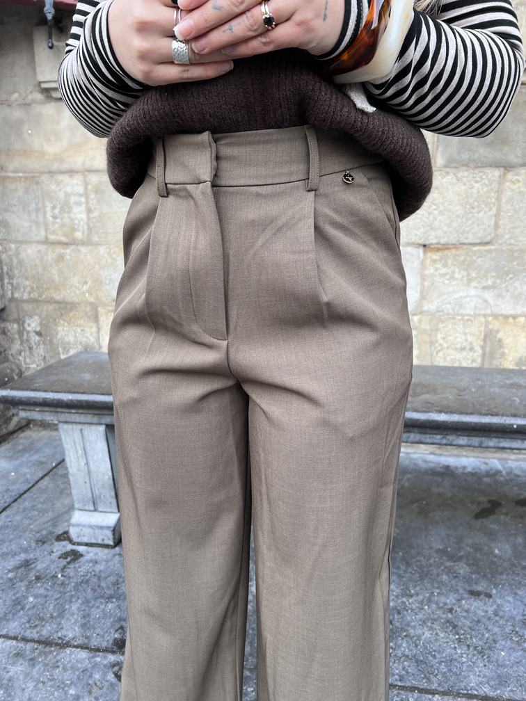 Deze straight leg pantalon is een stijlvolle toevoeging aan je garderobe. De broek heeft een hoge taille, plooidetails aan de voorzijde en een wijde pijp die elegant valt. De taupe kleur is makkelijk te combineren en geeft elke outfit een chique uitstraling. Perfect voor zowel een casual look als een geklede outfit.