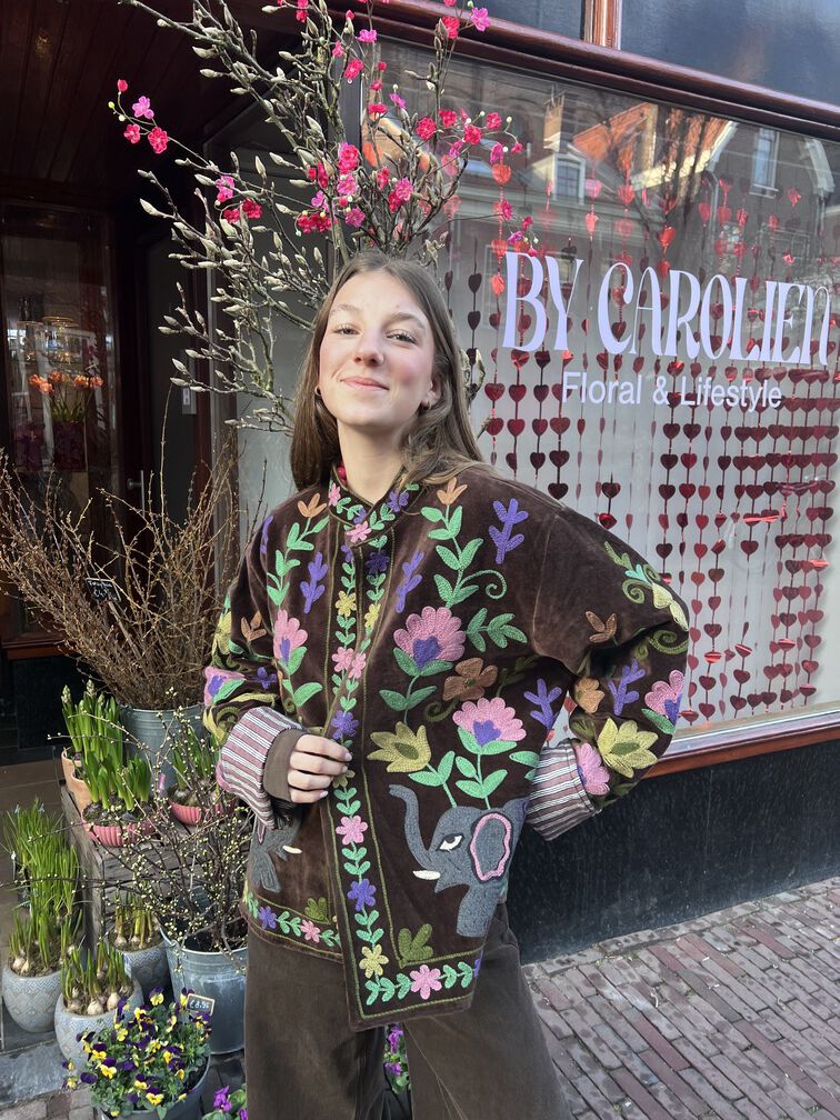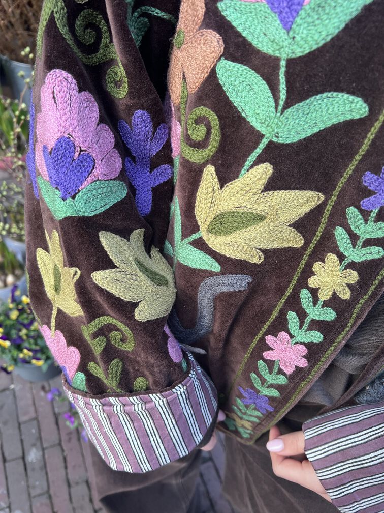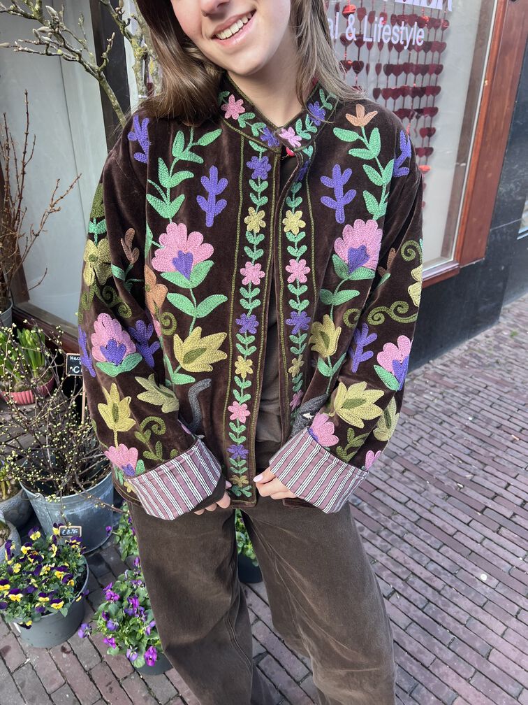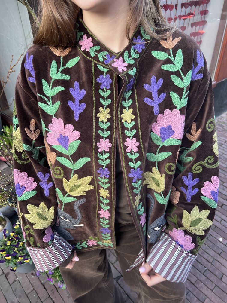 Dit bijzondere velvet jasje is rijk versierd met handgemaakte borduursels van bloemen en een olifant op de achterkant. De warme bruine kleur zorgt voor een tijdloze basis, terwijl de kleurrijke details het jasje extra speciaal maken. De zachte stof en fijne pasvorm zorgen voor een comfortabel draaggevoel. Een uniek statement item voor liefhebbers van bohemian stijl. One size en te dragen met maat XS to L.