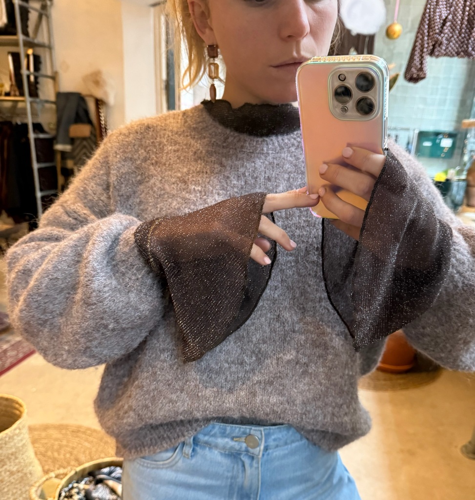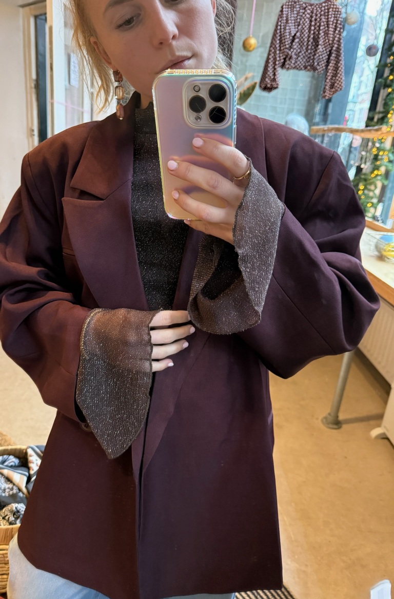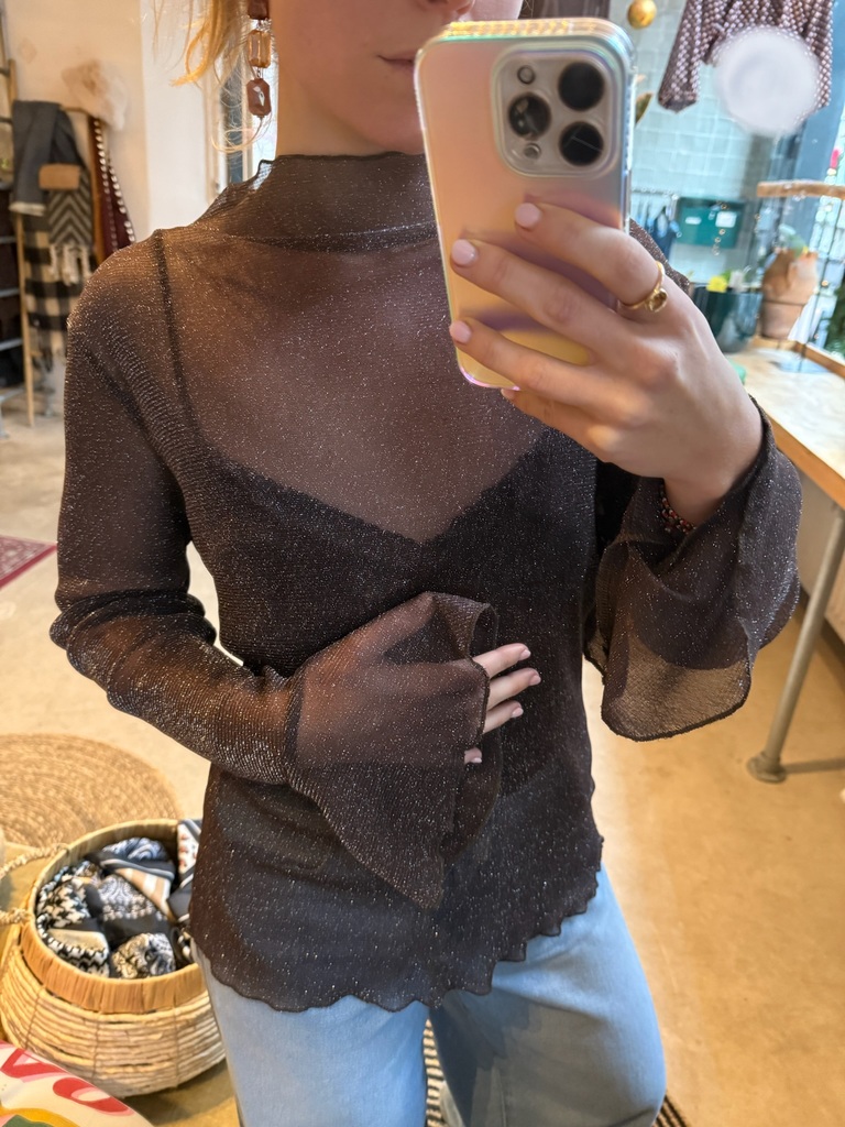 Een elegante semi-transparante mesh top met een subtiele shimmer die mooi meebeweegt met het licht. De stof is zacht, stretchy en valt soepel om het lichaam. De high neck en licht uitlopende mouwen geven de top een vrouwelijke, verfijnde look. Perfect voor feestdagen, dinners of als standout layer onder een blazer. Hij is er ook in het bruin.