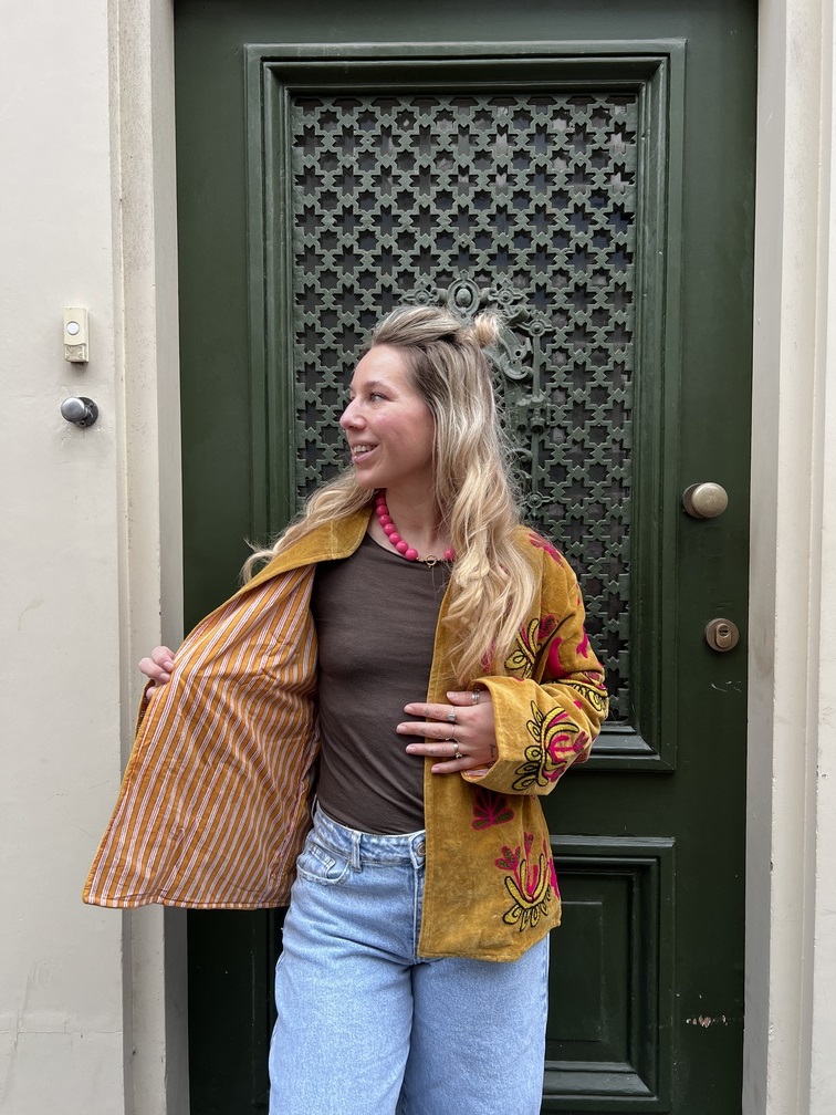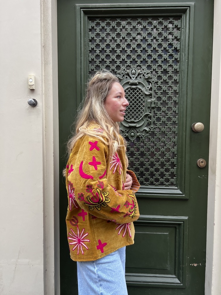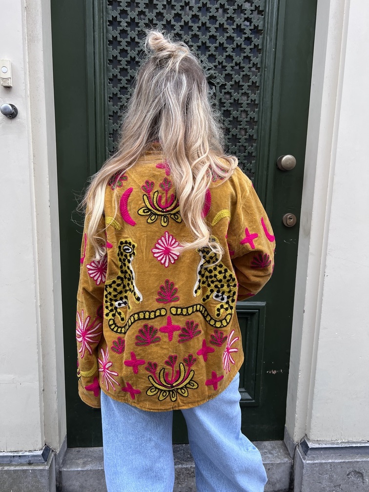 Dit unieke velvet jasje is een echte eyecatcher. Het jasje is rijkelijk versierd met geborduurde details en een opvallende leopard print op de achterkant. De zachte velvet stof geeft een luxe uitstraling, terwijl de losse pasvorm zorgt voor comfort. Perfect om je outfit een speelse en bohemian touch te geven. Elk item is uniek en vol karakter. Het is een one size en te dragen met maat XS tot L.