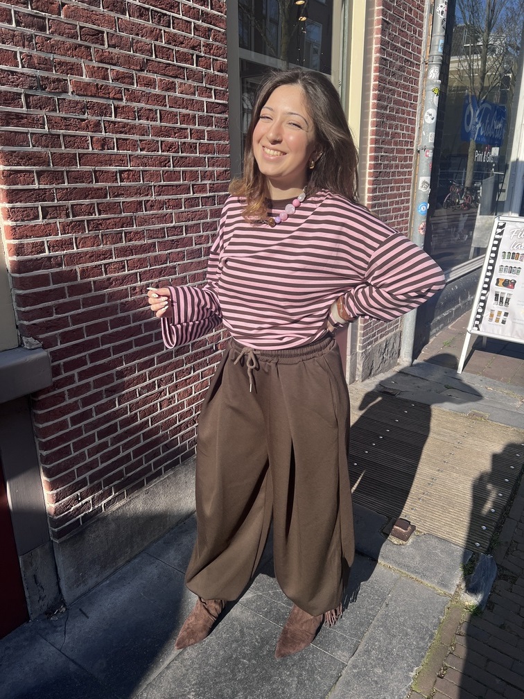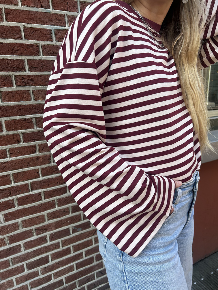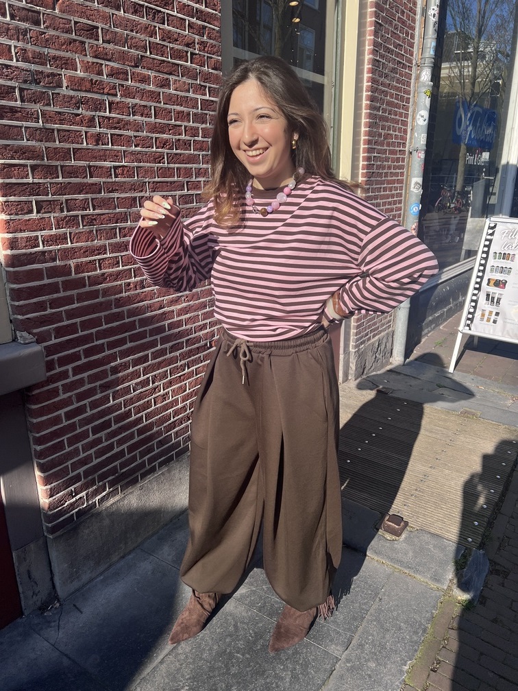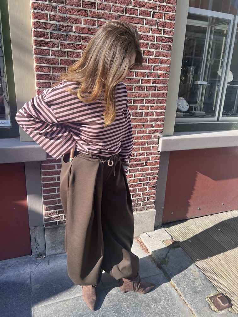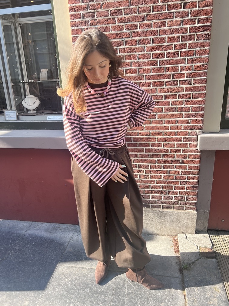 De gestreepte longsleeve in roze en bruin is een echte eyecatcher met een zachte, warme uitstraling. de kleurcombinatie geeft je outfit meteen een zachte, warme uitstraling. De kleurcombinatie geeft je outfit meteen een speelse, maar stijlvolle twist en is verrassend makkelijk te combineren.