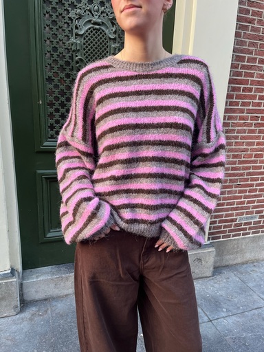 Deze heerlijke warme oversized trui combineert verfijnde strepen in een kleurenmix van lichtpaars, bruin en zwart. De losse pasvorm geeft een ontspannen, comfortabele look.