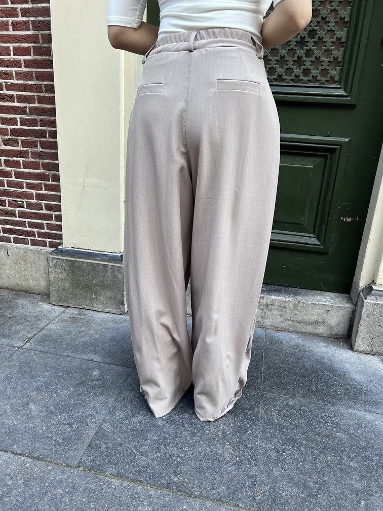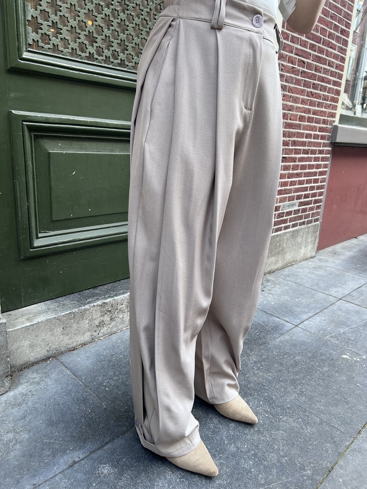 Deze taupe variant van de Martine broek met wijde plooien geeft je outfit meteen een speelse en stijlvolle twist. De soepel vallende stof beweegt mooi met je mee en zorgt voor een elegante, maar toch relaxte look.