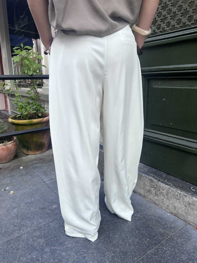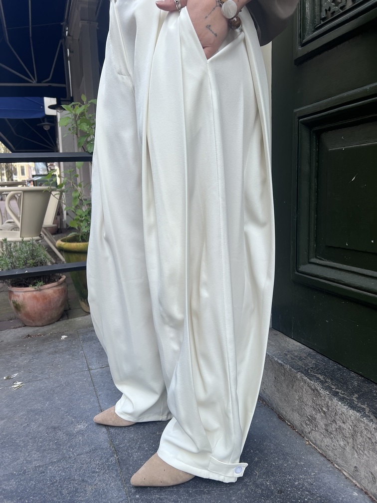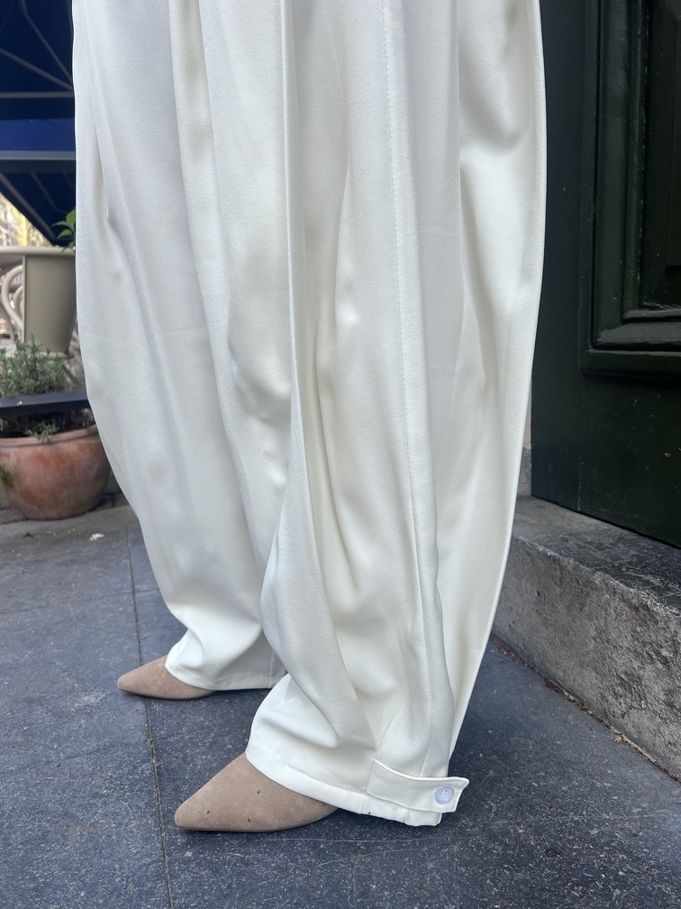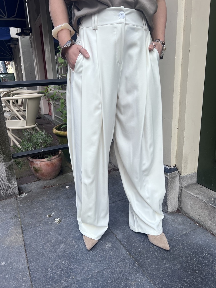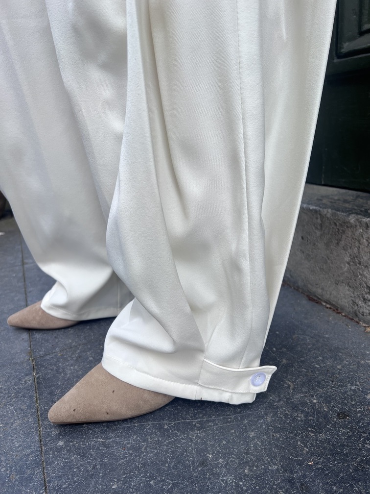 Deze witte variant van de Martine broek met wijde plooien geeft je outfit direct een frisse en speelse uitstraling. De soepel vallende stof beweegt prachtig met je mee en zorgt voor een elegante, maar toch ontspannen look. De knoopjes aan de onderkant maken deze broek extra leuk: kies voor een trendy ballon effect of draag ‘m als een klassieke pantalon—helemaal afhankelijk van jouw mood.