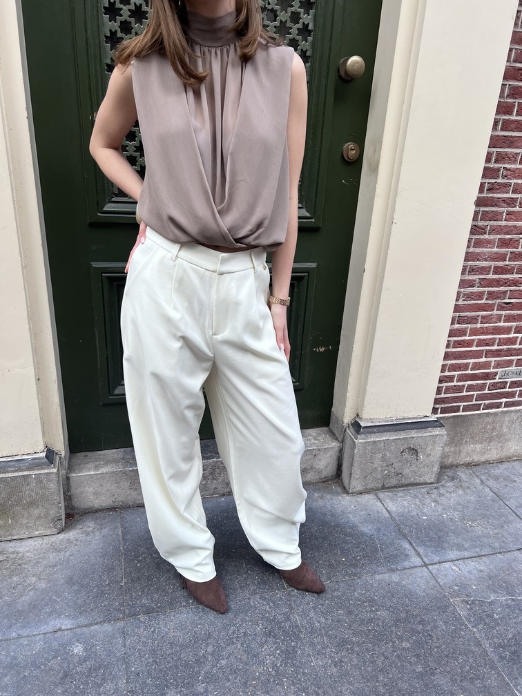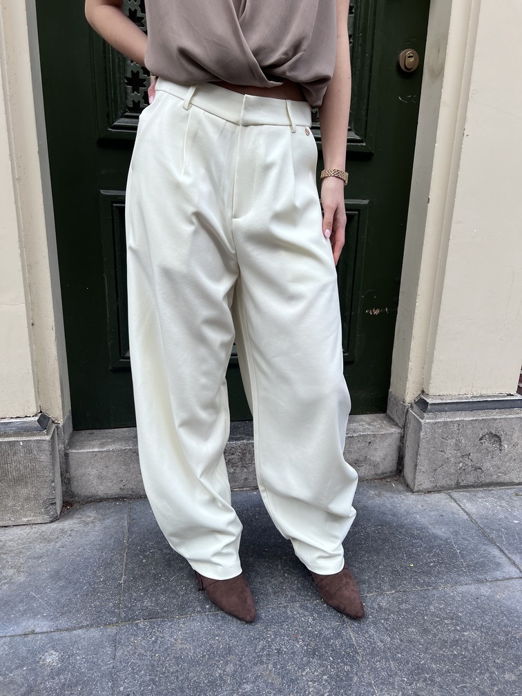 De subtiele off-white kleur geeft de broek een frisse, zachte uitstraling en maakt hem super veelzijdig. Je combineert ’m makkelijk met alle lentetinten, van zachte pastels tot frisse, opvallende kleuren. Of je nu kiest voor een casual outfit met sneakers of juist gaat voor een iets meer geklede look met laarsjes, de Nina ballonbroek valt altijd mooi en sluit perfect aan bij elke stijl.