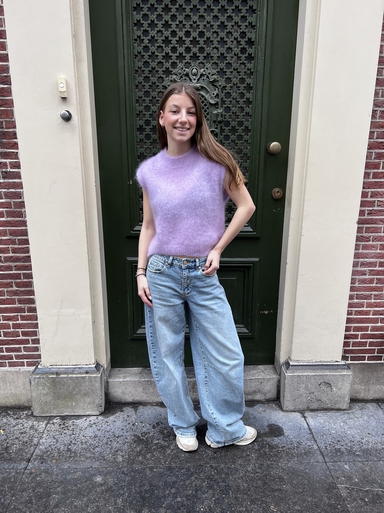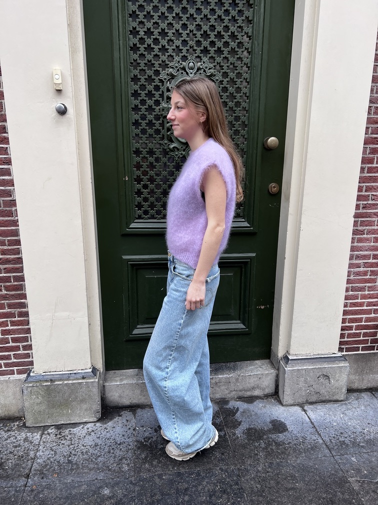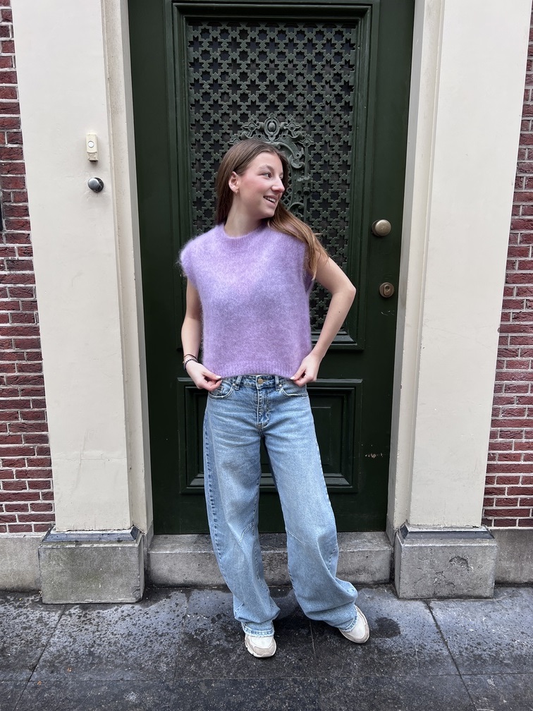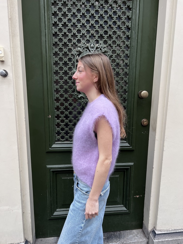 Deze dromerige lila top is er eentje om in te wonen. Gemaakt van een heerlijk zachte, fluffy knit met een subtiele mohair-look die licht en luchtig aanvoelt op de huid. De mouwloze snit en licht aangesloten pasvorm zorgen voor een vrouwelijke, moderne uitstraling, terwijl de hoge ronde hals het geheel net dat beetje extra geeft.