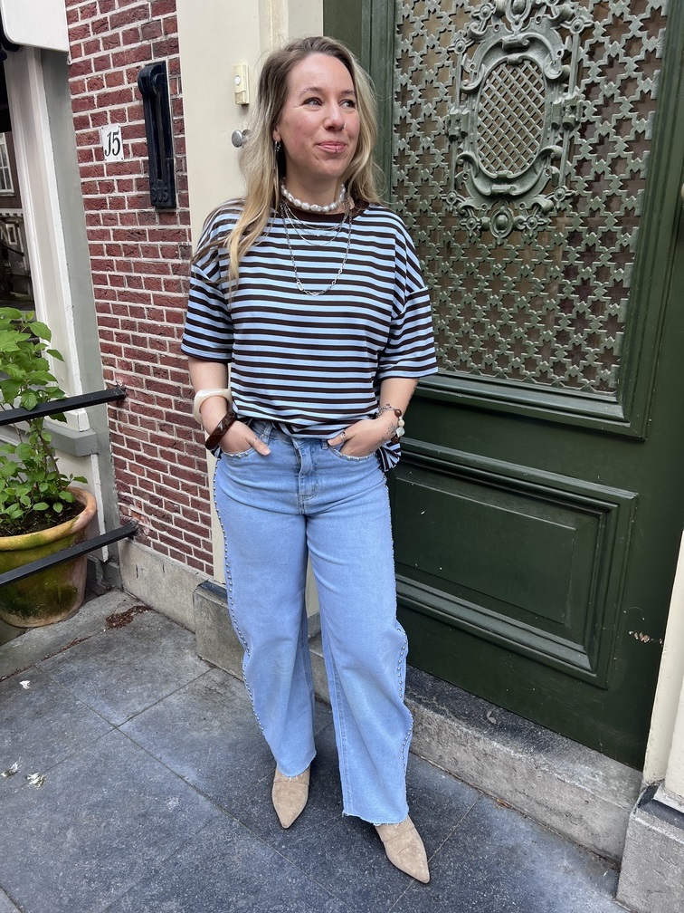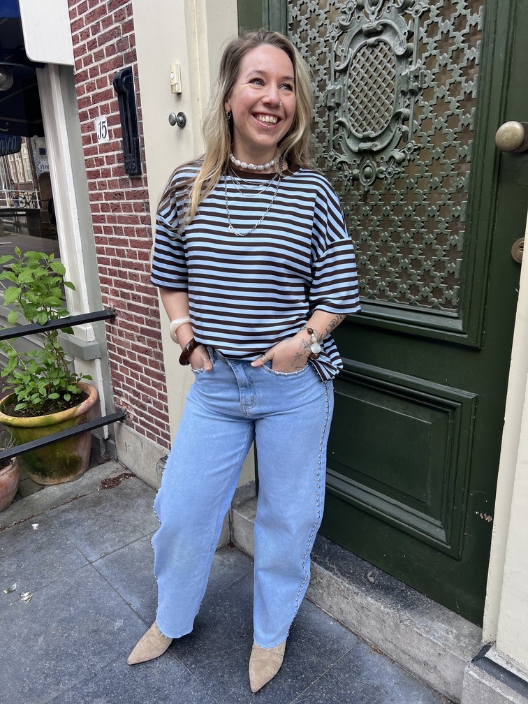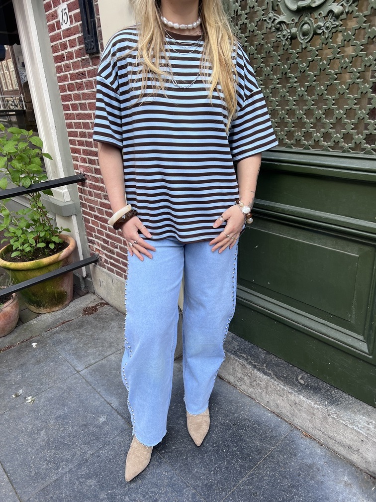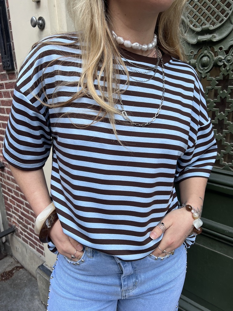 Het is tijd voor de spring collection! Dit gestreepte topje in blauw en bruin geeft een frisse, vrolijke touch aan je outfit en is helemaal ready om jouw look te maken. De oversized fit geeft je volop ruimte om te spelen met lagen en combinaties, terwijl het luchtige materiaal heerlijk soepel valt. Draag het los voor een casual vibe, stop het half in je broek voor een nonchalante touch, of combineer met een rok of short voor een opvallende outfit. Vind je deze kleurencombinatie top? Of kijk eens verder naar de andere leuke varianten uit onze collectie – er is voor ieder wat wils!