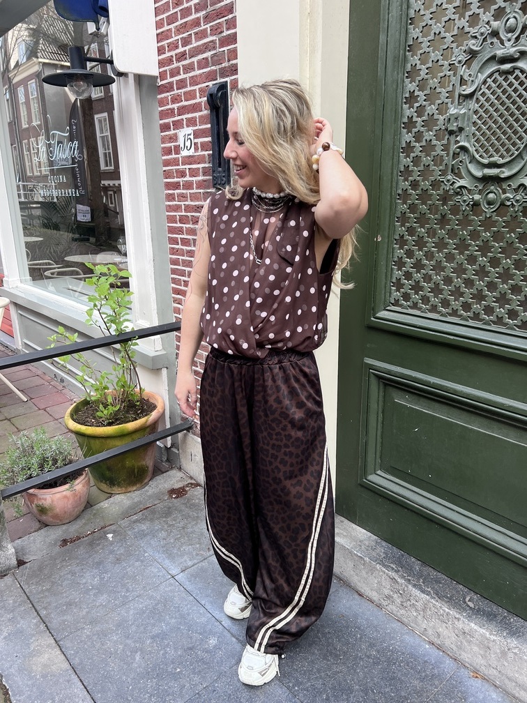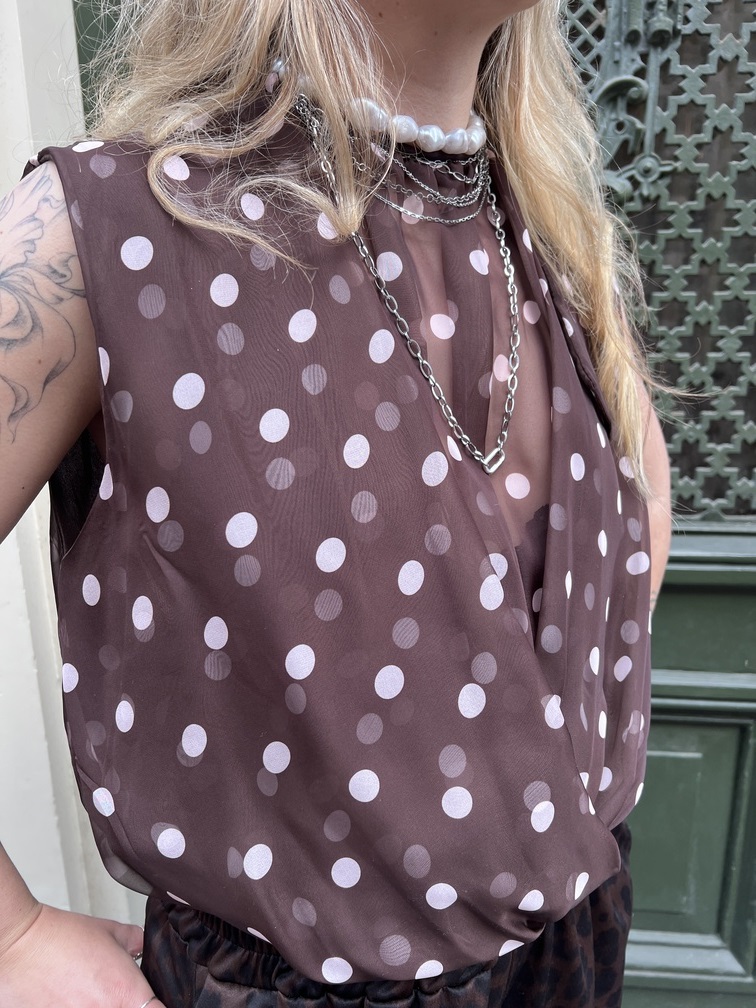 Maak je lente-outfits compleet met het mouwloze topje Beau uit onze spring collection! Het bruin met taupe gestipte topje is elegant en luchtig tegelijk. De flowy pasvorm en de overslag aan de voorkant geven een chique touch die prachtig staat bij een pantalon. Je knoopt het topje dicht met een mooie strik aan de achterkant. Ga je een avondje uit? Draag ‘m met een lange rok voor een stijlvolle, verfijnde look. Heb jij deze trend al in je kledingkast? Een echte must-have die je lente-outfits direct een elegante upgrade geeft! Bekijk Beau ook in onze zachte botergele kleur en in de chique taupe kleur.