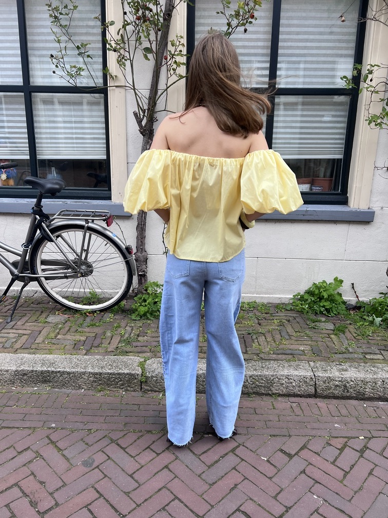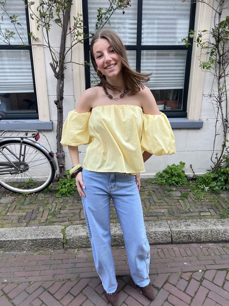 Dit zonnige topje uit de Spring Collection is er eentje waar je meteen blij van wordt. De zachte botergele kleur straalt frisheid uit en geeft je outfit een warme, trendy touch die perfect past bij het voorjaar.