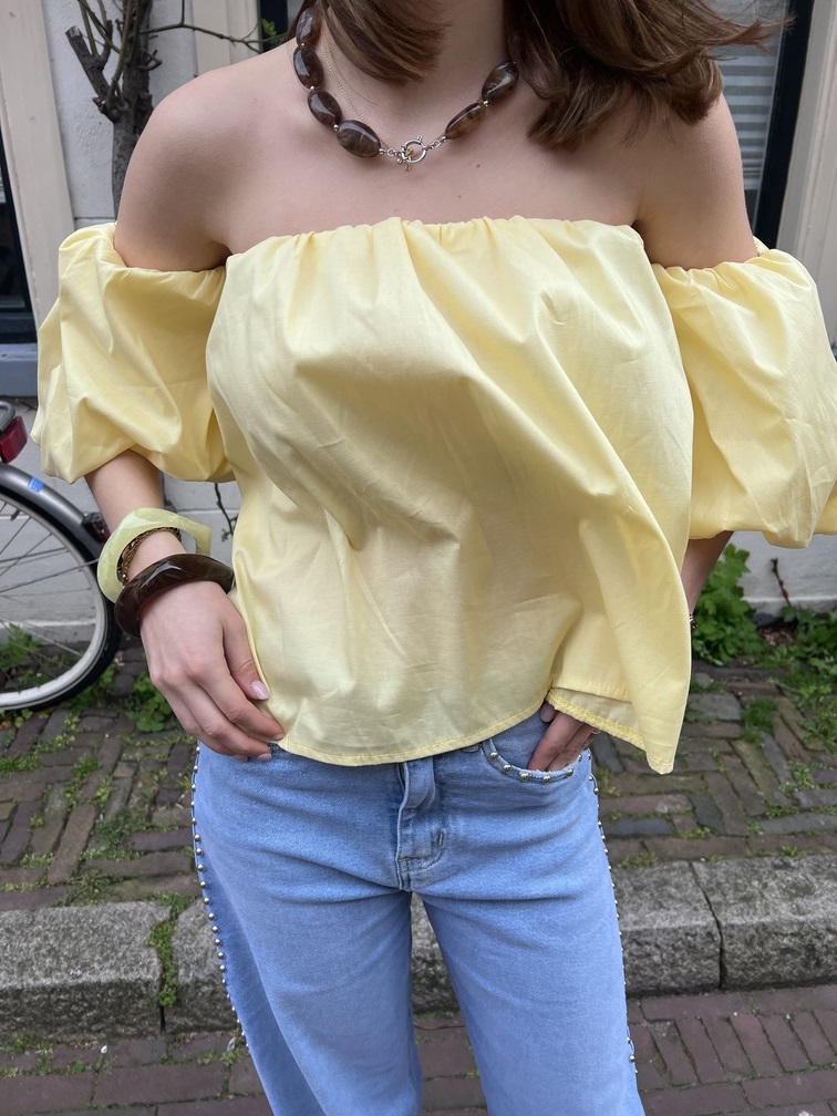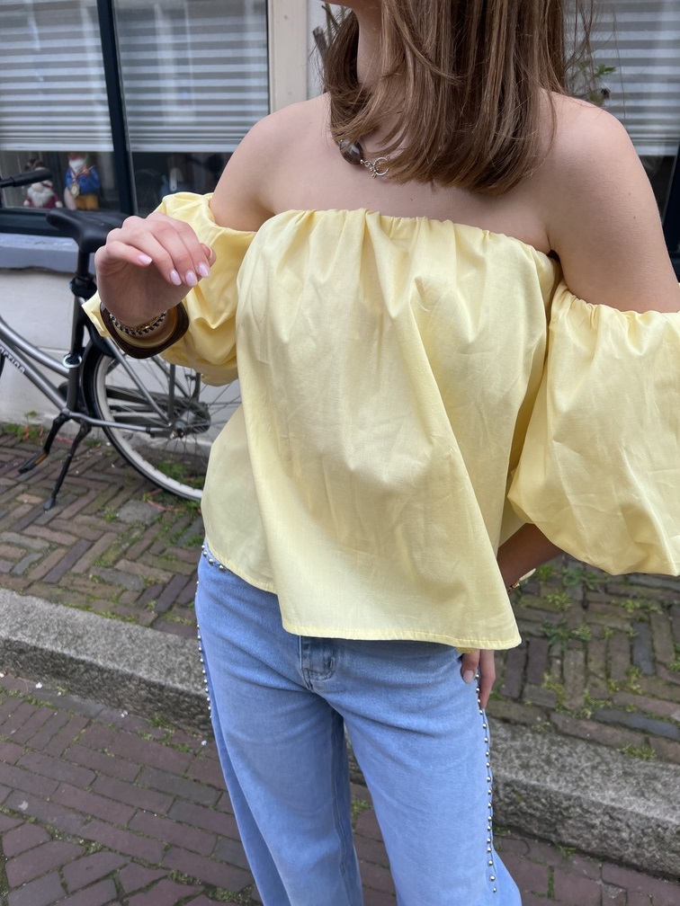 Wat dit item echt bijzonder maakt, zijn de gepofte off-shoulder mouwtjes die zorgen voor een speelse en vrouwelijke look. De flowy fit geeft het topje een luchtige, effortless vibe waardoor het heerlijk draagt op elke lentedag.