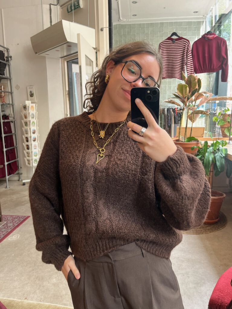 Deze cozy trui heeft een leuk kabel detail. In het bruin en beige!