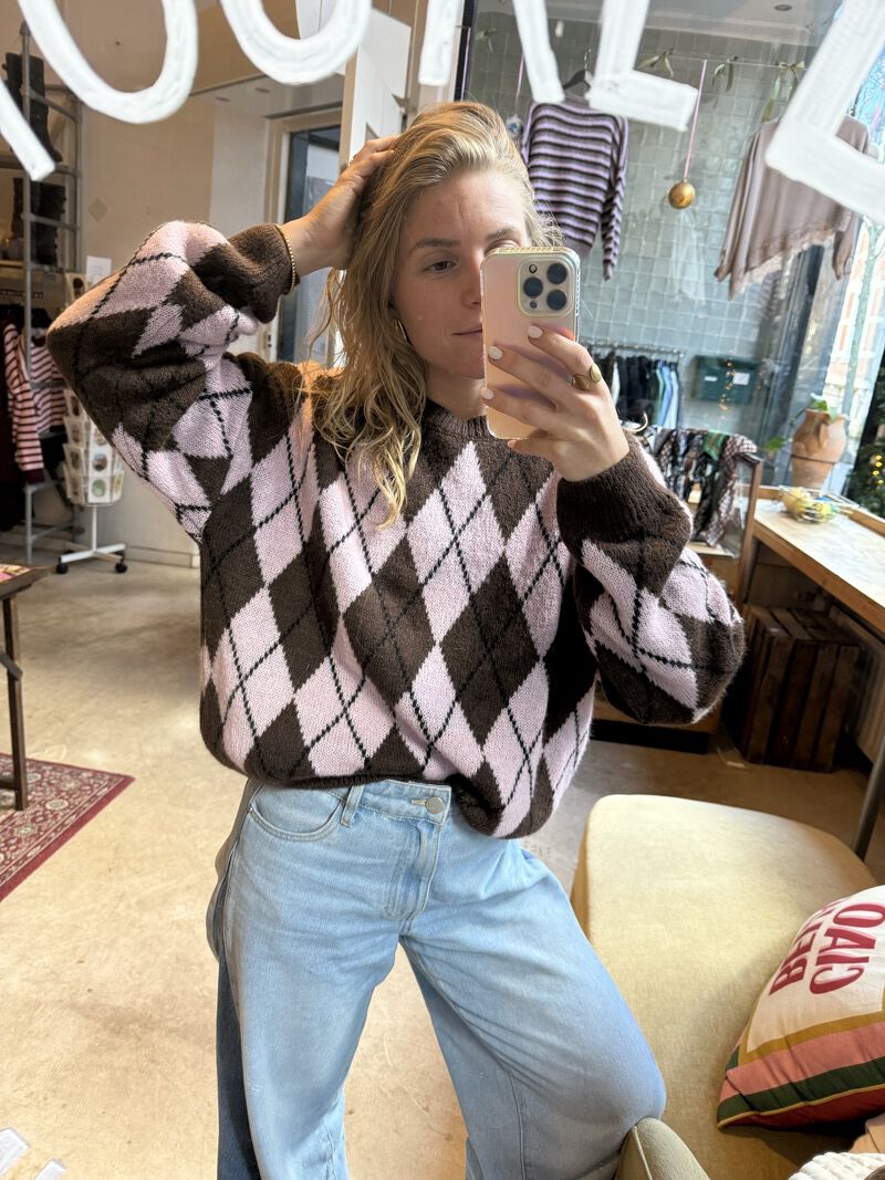 Een heerlijke warme trui gemaakt van een zachte stof. Leuk patroon om te combineren met een blazer, los te dragen op een pantalon of een korte rok met een panty.