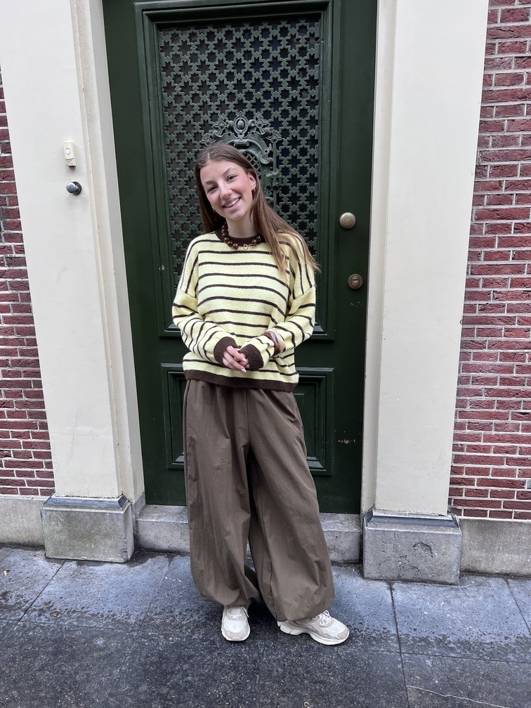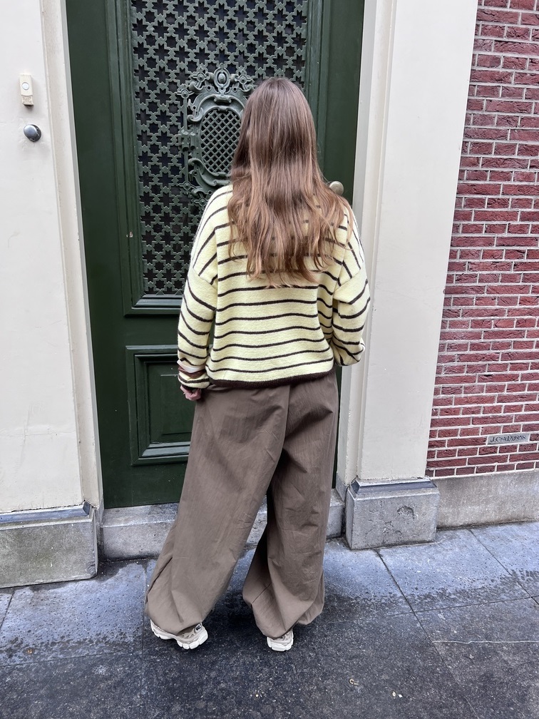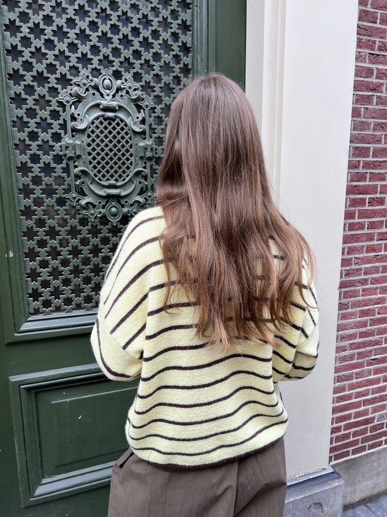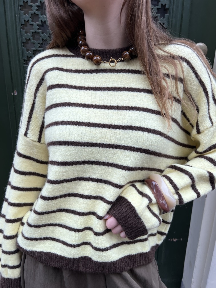 Deze zachte trui in romig botergeel met chocoladebruine strepen combineert comfort met een stijlvolle, tijdloze uitstraling.