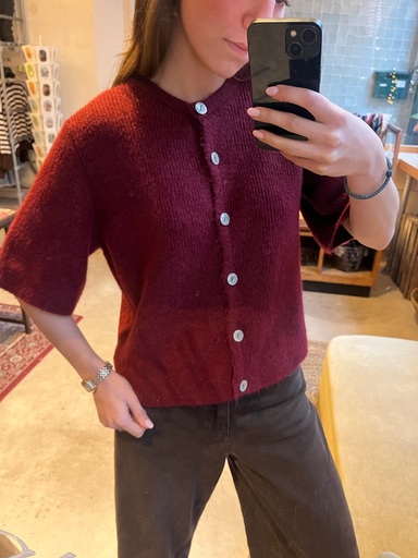 Dit heerlijk zachte vestje in bordeaux is een veelzijdig item dat niet mag ontbreken in je kast. Het vestje is eenvoudig te stylen met een kanten top eronder voor een trendy look of met leuke sieraden voor een stijlvolle uitstraling. Het model heeft een ronde hals, korte mouwen en een knoopsluiting aan de voorzijde. De one size pasvorm kan gedragen worden van een XS t/m M. Door het basic design is het vestje perfect te combineren.